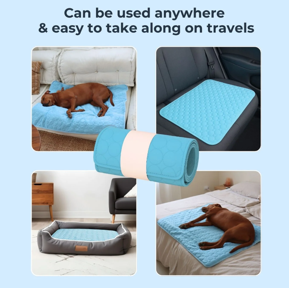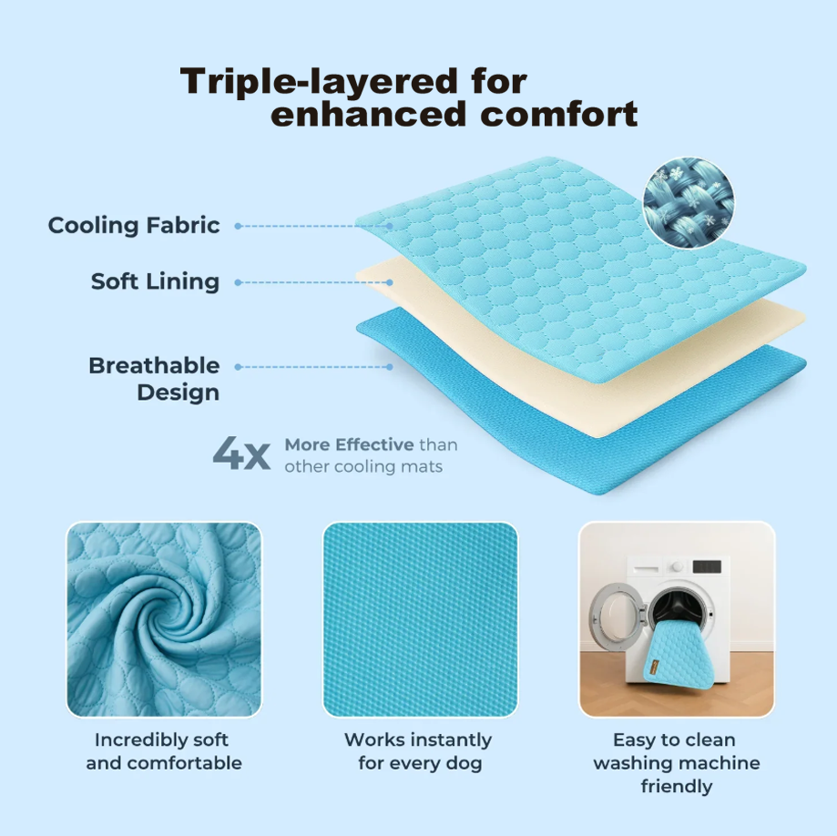 Our cooling mats are specially designed products that help lower a dog’s body temperature and prevent overheating. These mats provide a cool surface for dogs to lie on, promoting heat transfer from their bodies to the mat.